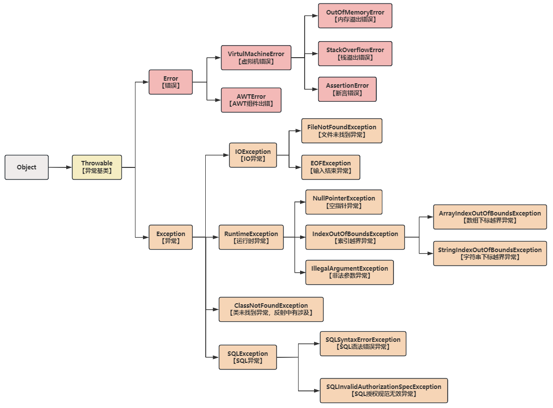 - Throwable 包含两个子类:Error(错误)和 Exception(异常),它们通常用于指示发生了异常情况。